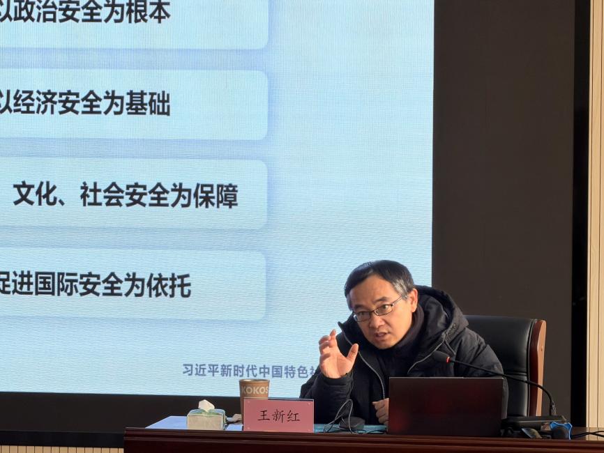 王新红教授从总体国家安全观的提出背景、核心内涵与实践成就等方面展开系统阐述。他提到,国家安全是民族复兴的根基,总体国家安全观是新时代国家安全工作的根本遵循。讲座深入解读了统筹发展与安全、维护政治安全、推进各领域安全等重点内容,强调要坚持底线思维、防范化解重大风险,构建统筹各领域安全的新安全格局。王教授结合历史与现实案例,生动阐释了维护国家主权、安全、发展利益的深远意义,鼓励师生增强国家安全意识,筑牢思想防线。