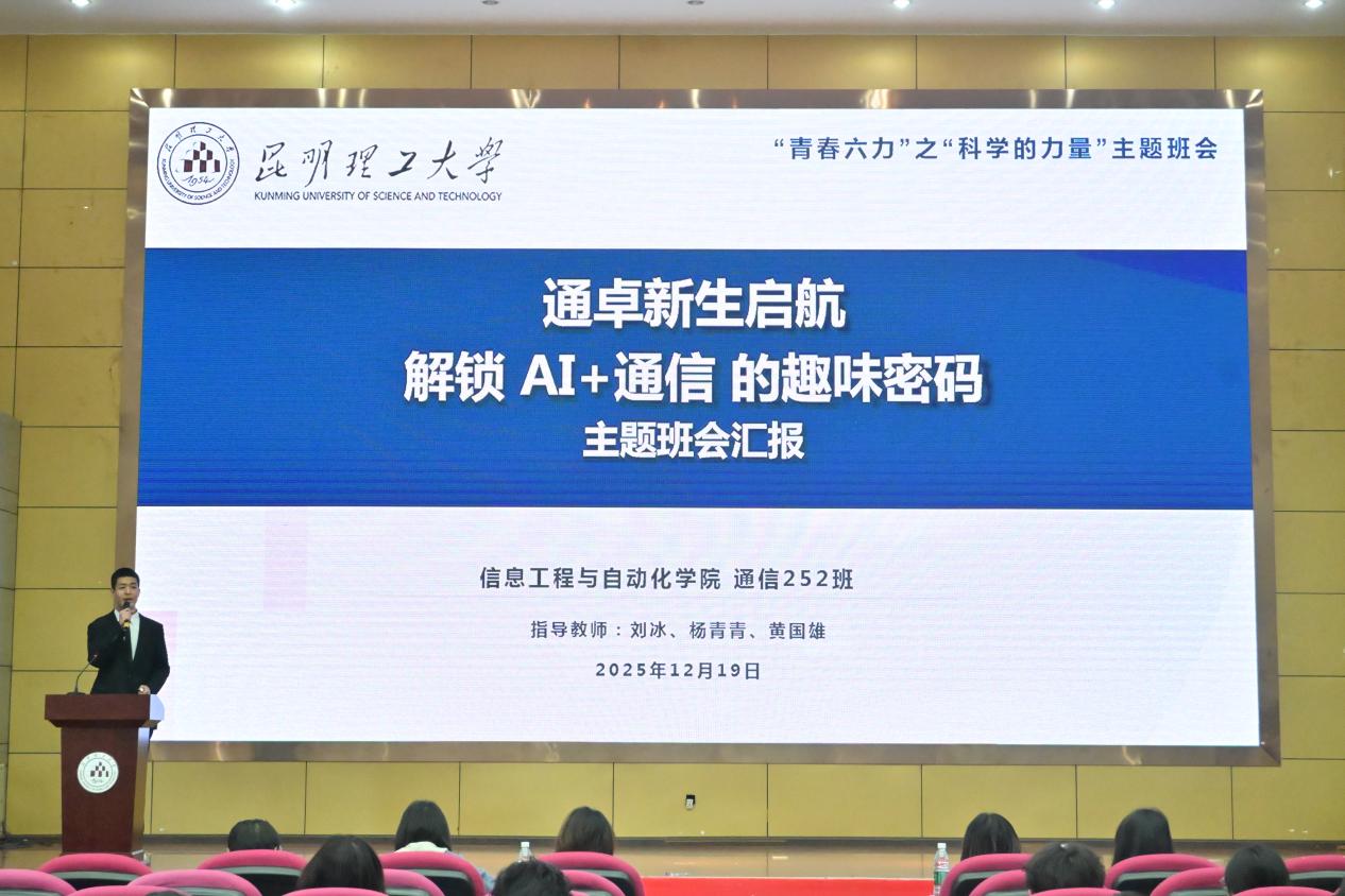 为深化思想政治引领、落实立德树人根本任务,引导青年将个人成长融入强国建设与民族复兴伟业,昆明理工大学于2025年12月19日开展“青春六力·筑梦中国”精品主题班会评选活动,从全校51个申报班级中遴选21个进行现场展示。在全校各班级踊跃参与、精心筹备的浓厚氛围中,信息工程与自动化学院通信252班的“青春六力之科学的力量——通卓新生启航:解锁AI+通信的趣味密码”主题班会脱颖而出,荣获“十佳主题班会”和“最佳创意奖”两项奖项。