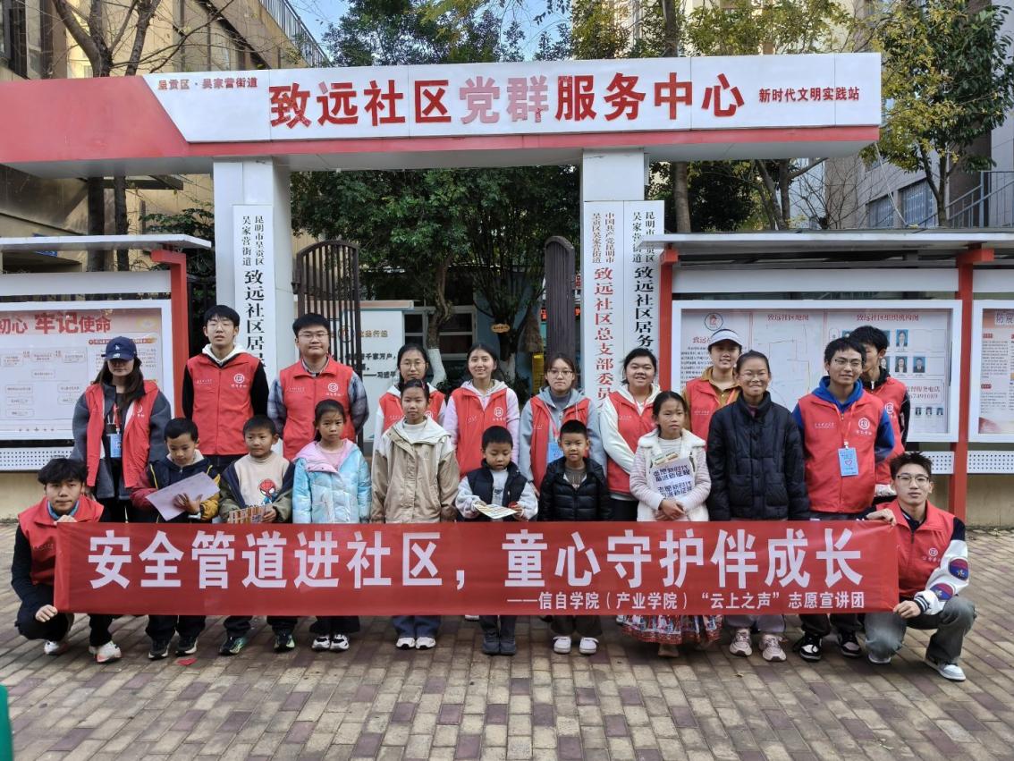 为贯彻落实习近平总书记关于国家能源安全的重要论述,进一步普及安全知识,提升社区儿童的安全防范意识,2025年12月28日,信息工程与自动化学院(人工智能产业学院)组织学院青年志愿者协会和学院“青马工程”青卓班学员前往昆明市呈贡区致远社区开展以"安全管道进社区,童心守护伴成长"为主题的大学生社区实践活动。